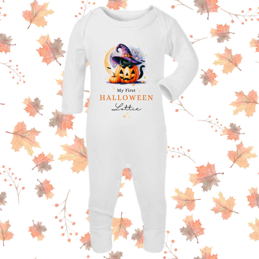Personalised Babies First Halloween Witches Cat and Pumpkin Babygrow / Bodysuit